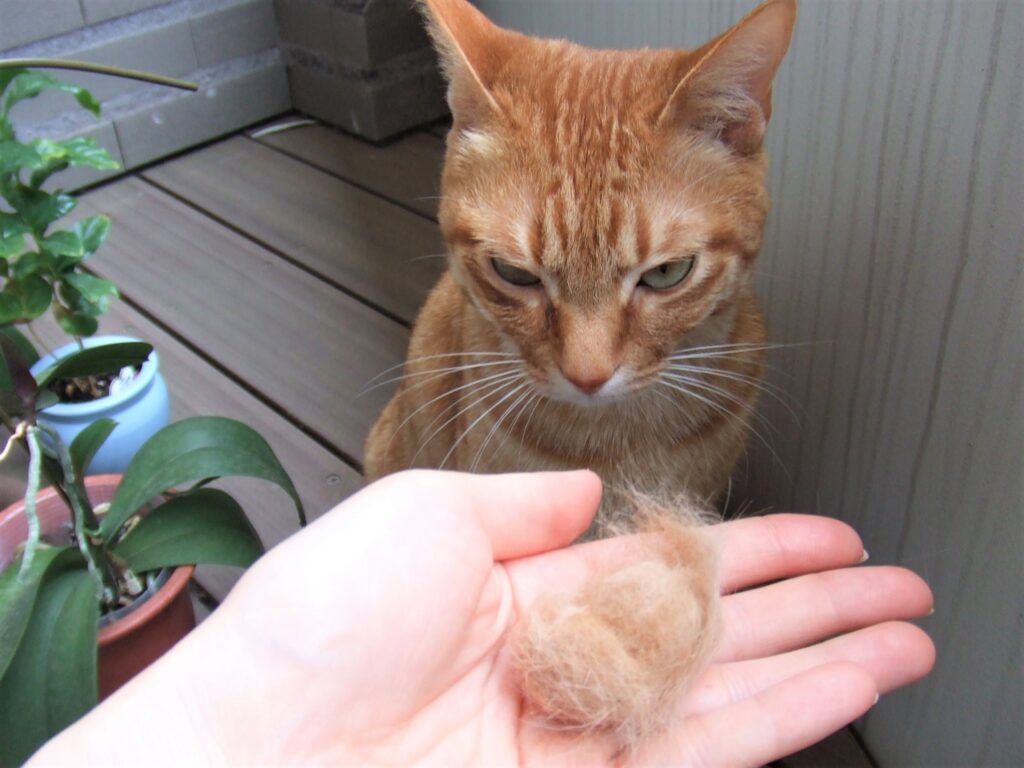 一歩も外に出ない子(完全室内飼い)の毛が向いていると聞いて、我が家の猫はまさしくそれ。さっそく、ブラッシングで毛を集めるところからスタートです。