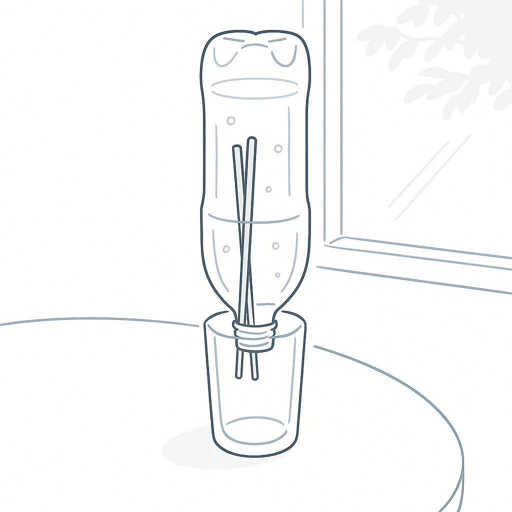 洗ったペットボトルを逆さにして、コップに立てた割りばしの上にかぶせるだけ。