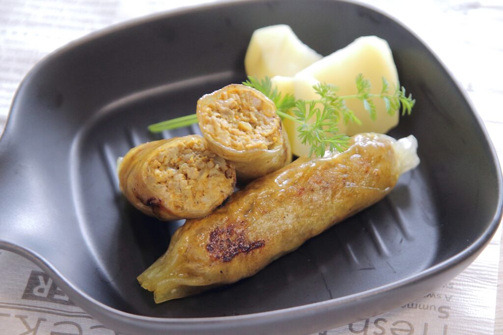 キャベツや白菜でタネを包むと、ロールキャベツ風ソーセージになります。